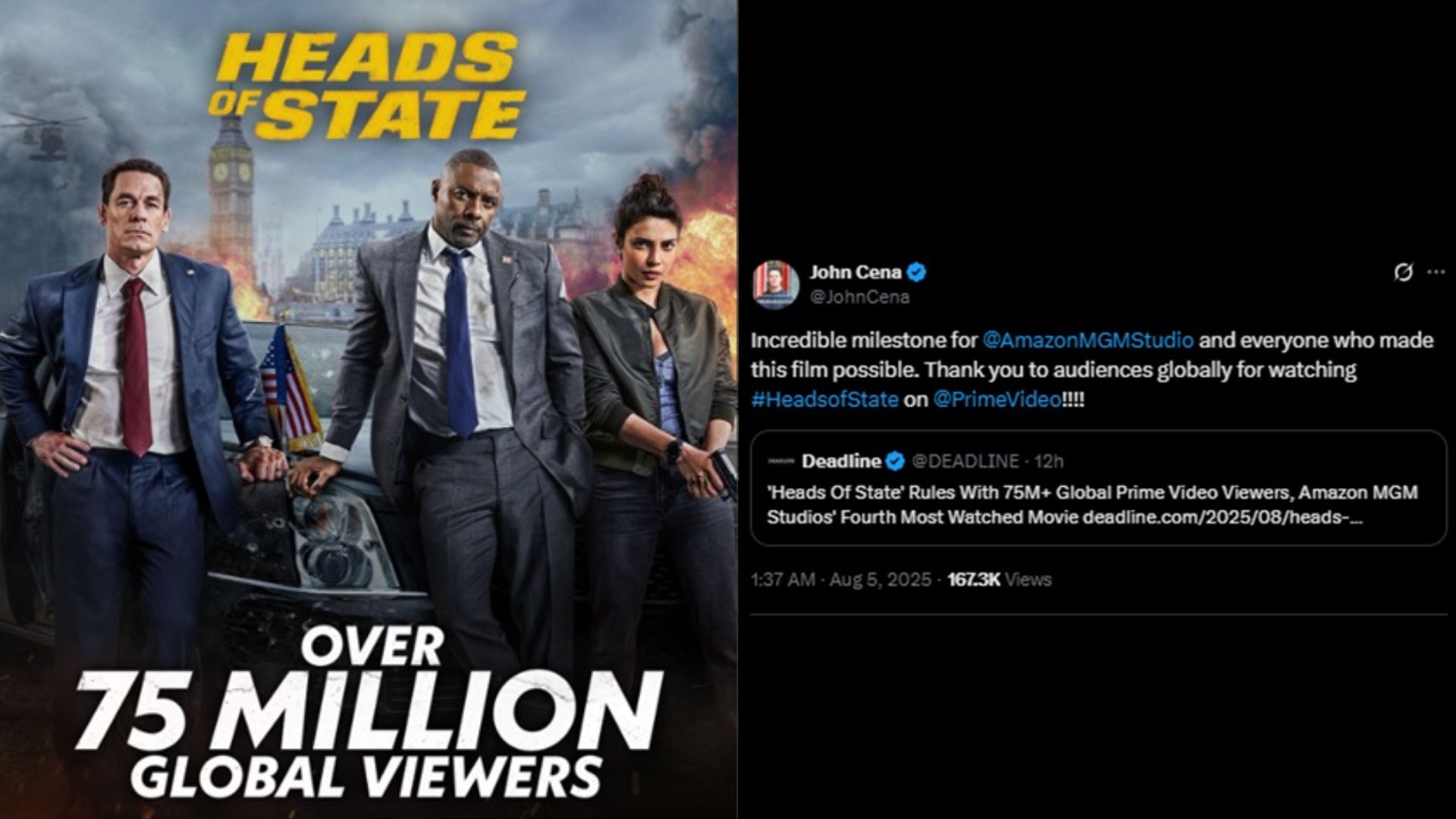 Reacting to this John Cena took to his social media expressing his gratitude, “Incredible milestone for @AmazonMGMStudio and everyone who made this film possible. Thank you to audiences globally for watching #HeadsofState on @PrimeVideo!!!!”