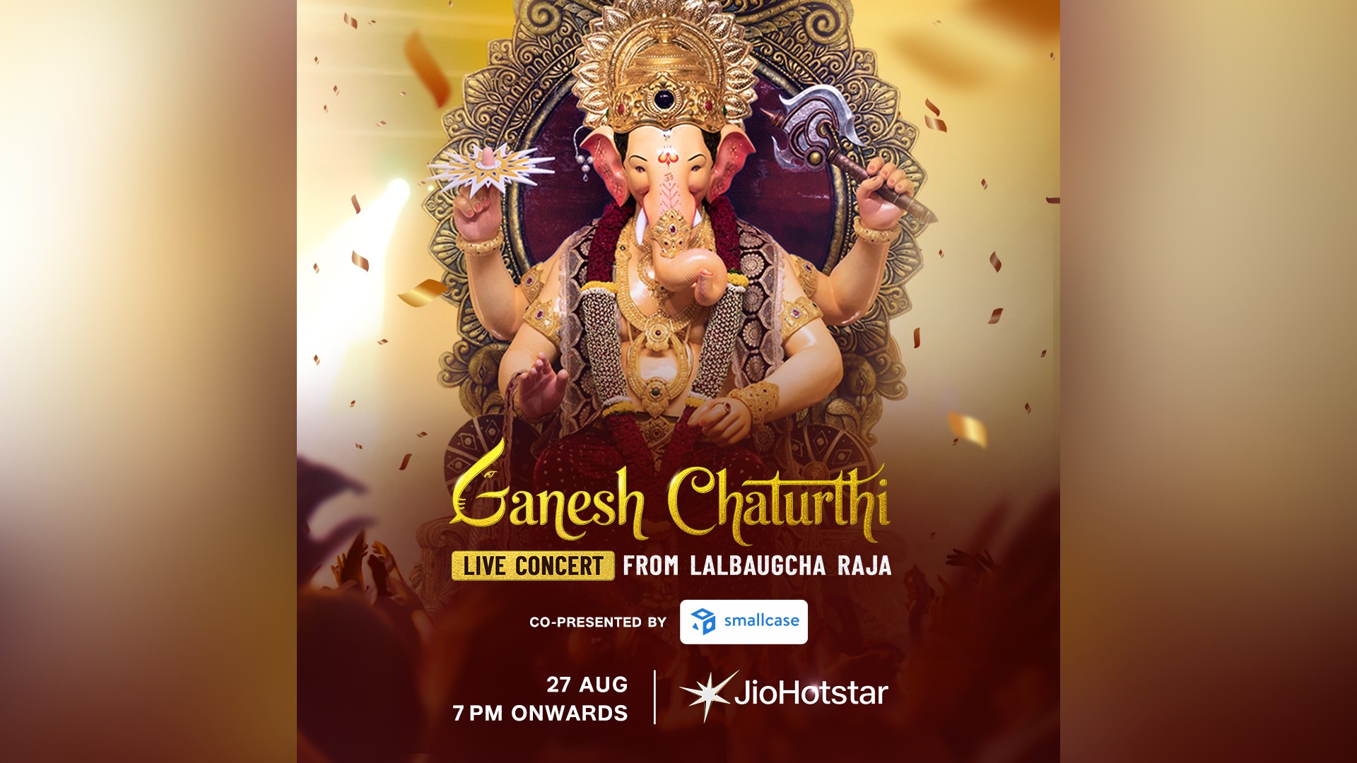 Co-presented by Smallcase, celebrate the arrival of Lord Ganesha with Ganesh Chaturthi – Live Concert from Lalbaugcha Raja on 27th August, 7 PM onwards, only on JioHotstar!
