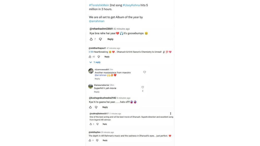 Composed by the legendary A.R. Rahman, ‘Usey Kehna’ blends hauntingly beautiful melodies with heartfelt lyrics that capture the ache of unrequited love. But what also has the netizens hooked are the song video’s intense glimpses from the film, with hard-hitting dialogues and visuals, offering a new look into the film’s layered narrative. Fans can’t stop sharing clips and reels from the song, flooding social media with comments like: one fan @siddharthapaul1 said, ”Dhanush and Kriti’s chemistry is unreal”, another fan @ArkRayDen commented, ”The depth in A.R. Rahman’s music and pain in Dhanush’s eyes… is just perfect!”, while fan @kushagrakushwaha2942 said, ”Kya hi gaana hai, hats off!” amongst a host of other positive others.