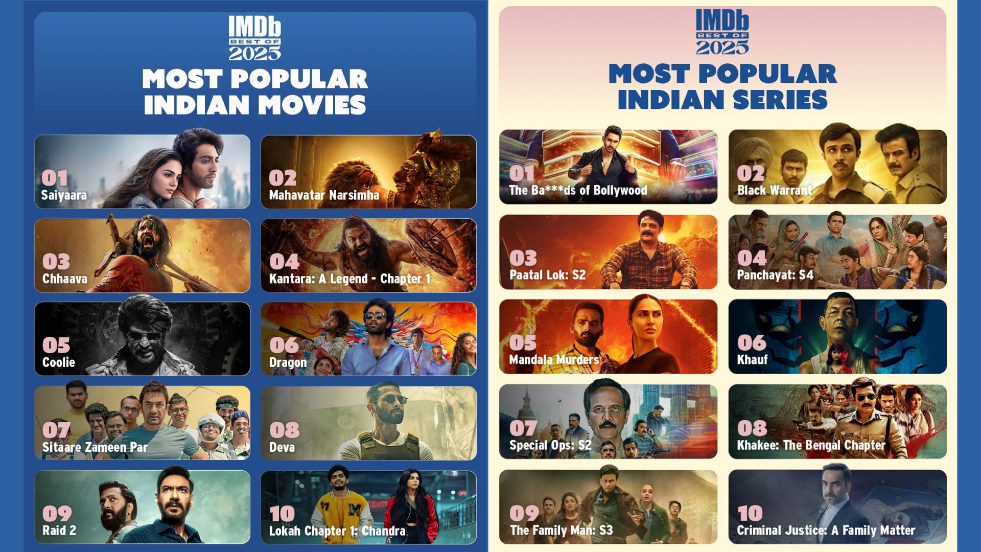 “The Most Popular Indian Movies and Series of 2025 lists demonstrate the boldness and innovation of Indian creators,” said Yaminie Patodia, head of IMDb India. “The diverse range of storytelling, spanning from romance to animation, superhero epics to satire, reflects the industry’s vibrancy. It’s especially exciting to see distinctly Indian stories and cultural narratives resonating with audiences around the world.”