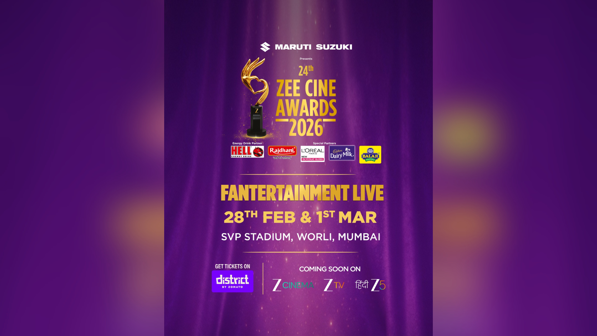Tickets are available on District by Zomato, while audiences across the country can watch all the magic later on Zee TV, Zee Cinema, and ZEE5.